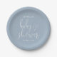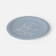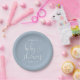Este prato de papel elegante em azul empoeirado para chá de bebê pode ser personalizado com seu nome e data do chá. Criado por Thisisnotme©