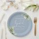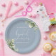Este prato de papel de chá de bebê com folhas de verde botânico elegante pode ser personalizado com suas informações em tipografia chic. Desenhado por Thisisnotme©
