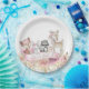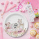 Pratos de papel para chá de bebê de menina com adoráveis animais bebês em um fundo de banner floral rosa. Estes pratos de papel para chá de bebê da floresta são facilmente personalizados para o seu evento adicionando o texto de sua escolha. Você também pode alterar a cor do fundo.