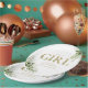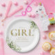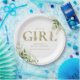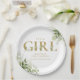 É um prato de papel de chá de bebê menina com elegante tipografia dourada e folhagem botânica verde bonita. Projetado por Thisisnotme©