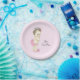 Louça de festa de chá de bebê princesa bebê menina adorável vestindo calças de babado e chinelos de coelho. Esses pratos de papel de festa de chá de bebê princesa fofa podem ser personalizados com texto no estilo de fonte e cor de sua escolha, e você pode escolher a cor de fundo.