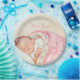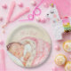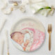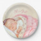 Pratos de papel para chá de bebê vintage meninas com adorável bebê dormindo enrolada em cobertores rosa e floral em um fundo vintage suave com o texto "É uma Menina!" no topo. Você pode adicionar texto no estilo de fonte de sua escolha para personalizar, ou excluir o texto de exemplo nestes doces pratos de papel para chá de bebê vintage.