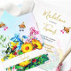 Um buquê floral com uma abelha e um pacificador cor-de-rosa no convite personalizado. Uma abelha carregando um pacificador cor-de-rosa sobre um fundo rústico. Parte de uma suíte de papéis de carta temáticos de abelhas.