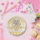 A design do produto apresenta um coala bebê rodeado de flores sobre fundo de faixas de efeito ouro. Este desenho animado faz pratos de papel bonitos e únicos com texto personalizado para crianças aniversários, chás de fraldas, Natal ou qualquer outra ocasião especial!