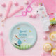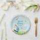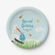 Uma bela placa de papel de chá de fraldas de menino personalizável apresenta uma entrega especial de carregando de cegonha puxada à mão, com abelhas e borboletas em um prado. Uma cegonha azul faz uma entrega especial de um bebê. Celebrar a chegada do novo menino com este prato de papel do bebê bebezinho fofo. Personalize a placa do chá de fraldas com seu texto e informações.