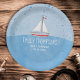 Esta design apresenta uma aquarela azul de chá de fraldas, um simples veleiro branco e giro, um estilo de tipografia fofo de na moda, um adorável design doce minimalista, um tema de barco oceânico azul, uma placa de papel fofo para festas de bebês, uma mesa de mesa para festas de janto, uma náutica azul vermelha e marinho, uma data personalizada personalizada de nome, uma placa de papel doce desenhada trabalho de arte por Laura Lacina.