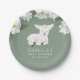 Folha de papel de chá de fraldas com tema de cordeiro bonito, com ilustração de uma ovelha bebê, que se deita com um sorriso doce no rosto. Há flores brancas de magnólia no topo. O fundo é verde. Esta doce design neutra de gênero é excelente tanto para bebês como para meninas.