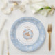 Um veado está quase aqui! O Chá de fraldas de Natal Plates com um belo veado-bebê no inverno na coroa feita com biscoitos de pão-de-gengibre e bagas de inverno em azul, branco e bege. Personalize facilmente o texto - Kate Eden Art