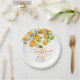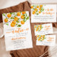 Placa de chá de fraldas com tema bonito, com ilustração aquosa da fruta laranja em uma ramificação de árvore. O texto diz: "um pouco bonito está a caminho." Design neutro em gêneros para uma festa de verão.