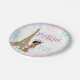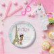 Placas de papel em Paris com princesa étnica bebê vestindo calças cor-de-rosa e cordas de pérolas com Torre Eiffel dourada em um lindo fundo azul-rosa e azul-lacre. Essas lindas placas de papel do chá de fraldas de Paris podem ser personalizadas com texto no estilo de fonte e na cor de sua escolha, e você pode escolher sua própria cor de fundo.
