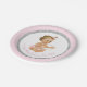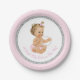 Placas de papel de chá de fraldas, cor-de-rosa e prateada, com uma adorável menina a vestir calças roxas cor-de-rosa e cordas de pérolas num fundo cor-de-rosa e cintilação prateada. Essas lindas placas de papel de chá de fraldas podem ser personalizadas com texto no estilo de fonte e na cor de sua escolha. Você também pode alterar a cor de fundo. Este é um design impresso sem pérolas reais, brilho, etc.
