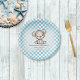 Urso bebê adorável pronto para um piquenique, projetado para sua família, amigos e convidados. Aproveite uma chá de fraldas de piquenique com este urso bonitinho em um plano de fundo azul e branco. Modelos feitos para você.