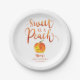 Placa de papel de chá de fraldas com tema de pêssego bonito, mostrando uma ilustração de um pêssego com um sorriso doce no rosto. O texto da tipografia acima diz "doce como pêssego" em escrita manuscrita. Excelente para o primavera ou chá de verão de uma menina.