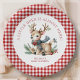 Apresentando as nossas placas de papel de rena de Natal - a adição perfeita ao seu chá de fraldas festivo! Apresentando uma linda rena de bebê com folhagem de inverno em um fundo de xadrez vermelha.
