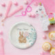 O design de chá de fraldas de placa de apresenta um coelho de mamilo e mãe. Eles estão sentados entre flores macios e precoces de primavera. ~