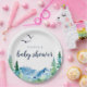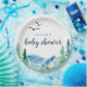 Esta placa de papel de chá de fraldas é perfeita para um chá de fraldas ao ar livre. O design apresenta uma paisagem de natureza selvagem pintada, azul e verde, com pinheiros de aquarela, pássaros e montanhas. Personalize as placas descartáveis com o nome da futura mãe.