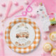 Este charmoso prato de papel traz todas as vibrações confortáveis de uma celebração de outono para a sua mesa. Um clássico borda de xadrez de búfalos laranja e branco enquadra uma linda cena de aquarela, apresentando um caminhão de safra rusticado que passa por abóboras. Os sotaques florais elegantes e as fontes moles completam a aparência, fazer-a como o pedaço perfeito de louça para o seu chá de fraldas de outono. É uma maneira adorável de servir doces e celebrar a chegada da sua abóbora ao estilo.