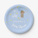 Para um chá de fraldas celebrando um menino. Um fundo azul claro. Um ursinho de pelúcia segurando um balão azul, estrelas amarelas. Personalize e adicione o nome da mãe a ser.
