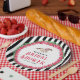 Este prato de festa Derby tem um cavalo de corrida em aquarela com um jóquei de rosa rodeado por uma coroa de rosas vermelhas com a frase "Chá de Noiva". Há um fundo listrado em preto e branco. Você pode personalizar com um nome e data.
