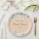 Prato de papel elegante e bonito para chá de noiva com flor de branca, apresentando uma delicada moldura de flores da primavera com os detalhes do seu chá de noiva em texto dourado elegante sobre um fundo cor de pêssego. Personalize com os detalhes do seu evento especial. Criado por Thisisnotme©