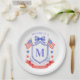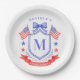 Este design de prato de papel para chá de noiva patriótico apresenta um brasão em aquarela com um brasão patriótico vermelho claro, branco e azul com bandeiras americanas e um laço azul. Você pode personalizar com seu monograma e nome.