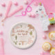 Chá de noiva tema western rústico prato de papel com ilustração de motivos de cowgirl. O texto diz "apronto para o amor".
