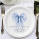 Elegantes pratos de papel para o chá de panela da noiva com um laço azul coquette em aquarela, "algo azul antes de eu me casar" em uma fonte caligráfica sofisticada, e o nome da noiva e a data do chá em letras modernas simples.