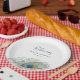 Uma combinação perfeita com nossa suíte de chás de panela de Penas de Aquarela, essas placas de papel elegantes são um toque adorável. Design apresenta uma pena de pavão de aquarela solteiro com o seu texto personalizado — nome de convidado de honra, tipo de evento e data — na coordenação das letras azul e indigo da meia-noite.