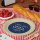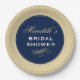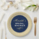 As placas de sobremesa de chá de panela de casamento elegantes apresentam o nome da noiva e o título do evento "Chá de panela" com um detalhe de rolagem e design de borboleta com padrão de borboleta. Meia-noite / marinho azul com marfim branco suave / leve e ouro de champanhe.