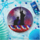 Uma silhueta do gato negro de Théophile Steinlen para o clube Le Chat Noir num cenário moderno para o dia 4 de julho. O gato está vestindo um chapéu tricorne. A Estátua da Liberdade está no fundo junto com fogos de artifício vermelhos, brancos e azuis.