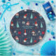 Add your family name and celebration date to these paper plates with whimsical holiday design featuring Santa cupcakes, snowmen, gift boxes, string lights, and snowflakes on a dark blue background.