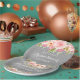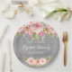 Um prato de papel estilo rústico para uma chuva de presentes. Com flores de dália contemporâneas pintadas à mão em rosa, pêssego e coral. Uma parede de madeira cinza rústica como fundo. O nome é escrito com letra manuscrita branca.