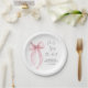 Pratos de papel para chuveiro de noiva elegantes com uma aquarela de um arco coquete rosa claro, "Ela está dando o nó" em uma fonte de caligrafia, e o nome da noiva e a data do chuveiro em letras modernas simples.