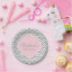 Cinza e padrão de fevron branco com placas de chá de fraldas cor-de-rosa pastel. Cinza e zigue-zague branco e no meio há um retângulo rosa pastel com seu texto personalizado.