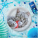 Placas de papel com uma fotografia de Natal fofinha de uma cinza de gato picando topicamente um chapéu vermelho de santa. Suas grandes patas fofinhas tornam esta foto muito encantadora.