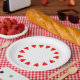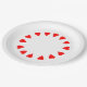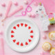 Formas de coração vermelho em um círculo na borda do prato. As bases das formas de coração apontam para o centro.