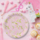 Pratos de papel de primavera com círculos rosa. O design pode ser transferido para guardanapos de papel correspondentes.
