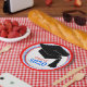 Use estas Formandos 2024, Boné Vermelho, Branco e Placas Azuis, para servir comida aos seus convidados. Personalize com seu ano de classe de formando. Ele apresenta um boné de formando com 'Classe de 2024' em um script na moda vermelho e azul.
