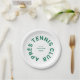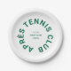 Pratos de papel Clube de Tênis Après custom green crest. Personalize com o ano, nome do clube / campeonato / torneio de tênis e local. Perfeito para uma festa de Wimbledon ou tênis aberto, para uma festa de clube de tênis local ou para uma festa de solteiro, despedida de solteira ou aniversário com tema de tênis. Projetado para combinar com nossa Coleção Clube Social Après Tênis.