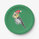 Uma pintura aquosa de um cockatiel macho com um chapéu de Natal e Holly na cabeça.