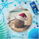 Um coco vestindo um chapéu de Papai Noel repousa em uma praia ensolarada com ondas suaves ao fundo.