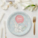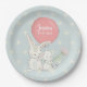 Placas de papel com dois coelhos pequenos e um balão personalizado com o nome.
