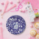 Num belo azul escuro e branco, um coelho coelho bonito sentado está rodeado de aves e de um cenário de floresta estilizado, recheado de folhas, flores, bagas e vinhas em espiral. A trabalho de arte foi inspirada pelos antigos motivos e cores Delft, Dedham e Chinoiserie oriental. Perfeito para uso diário em sua decoração azul e branca, ou para qualquer ocasião especial como uma festa de jardim. Arte e design originais peculiares, únicas, de Tuzi Williams. Vendido apenas pela Zazzle, com garantia de 100% do cliente.