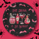 Esta design apresenta a frase "Coma, Beba e Assuste" em vermelho e também coquetéis de halloween com presas vampiros, crânios, morcegos e uma poção de veneno de aranha assustadora. Você pode personalizar o texto deste design. Veja toda a coleção correspondente. Toda trabalho de arte é desenhada à mão e copyright de Kaitlyn Thomas.