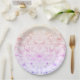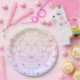 Pratos de papel com um design falso de brilho e lantejoulas em degradê roxo, rosa e amarelo. Perfeito para festas, chás de bebê, celebrações da Páscoa e muito mais!