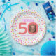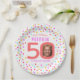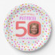 Bright colorida confetti pontos aleatórios aniversário de 50 pratos surpreendentes. Em coral vivo, rosa quente, amarelo ouro e verde azul aqua. Adicione a sua foto de aniversariante no centro do 0 em 50 e personalize com sua própria data de aniversário, hora e detalhes da festa. Outros itens correspondentes e anos de aniversário de marco disponíveis. Design original por www.mylittleeden.com no zazzle.