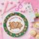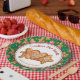 Chapas de papel festivo com biscoito festivo de Natal e padrão de doces em verde com contrastes vermelhos e brancos. Texto alterável para você editar com seus próprios detalhes no editor de texto "Personalizar". Coordenadas com guardanapos, uma toalha de cozinha, avental de assar e outras designs na coleção da cozinha de Natal em Pinkladybugs no Zazzle.