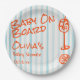 Como podem ver, este único e elegante bebê de verão na placa de papel do chá de fraldas do conselho tem um modelo bem projetado. Com limão e coquetel desenhados à mão laranja, e nome e data escritos à mão em laranja. E a aquarela claro céu azul listra fundo. O que você pode personalizar facilmente ao clicar no botão personalizar.