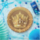 Uma coroa ouro, maravilhosamente decorada, com designs intrincados cercados por um padrão floral, simbolizando realeza, luxo e celebração, contra um fundo suave e neutro que aumenta sua elegância real.