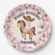 Bela vaquinha sela pratos de festas personalizadas. Cowgirl cavalgando um cavalo bebê fofo e flores rosa. Cores de fazenda castanho e amarelo-rosa.